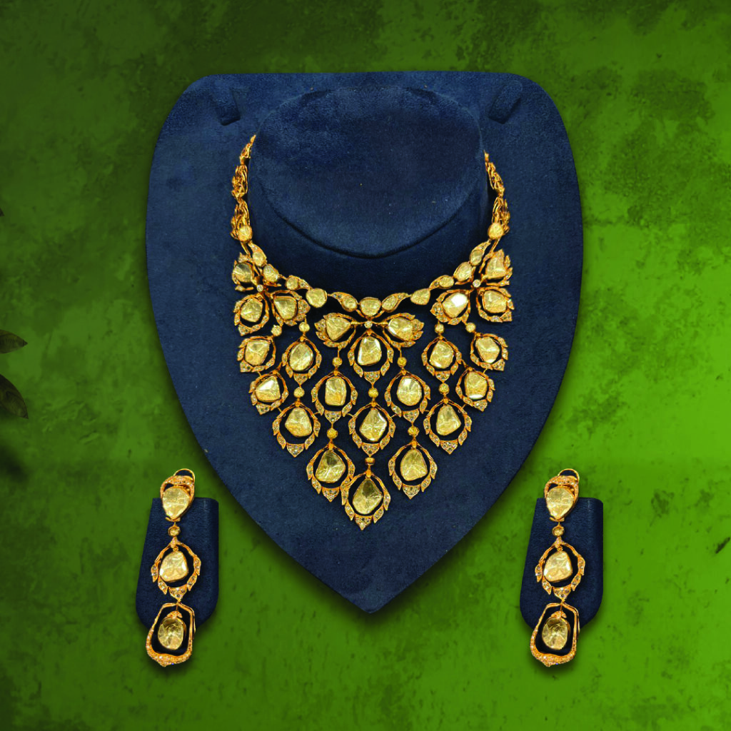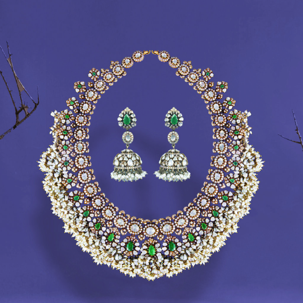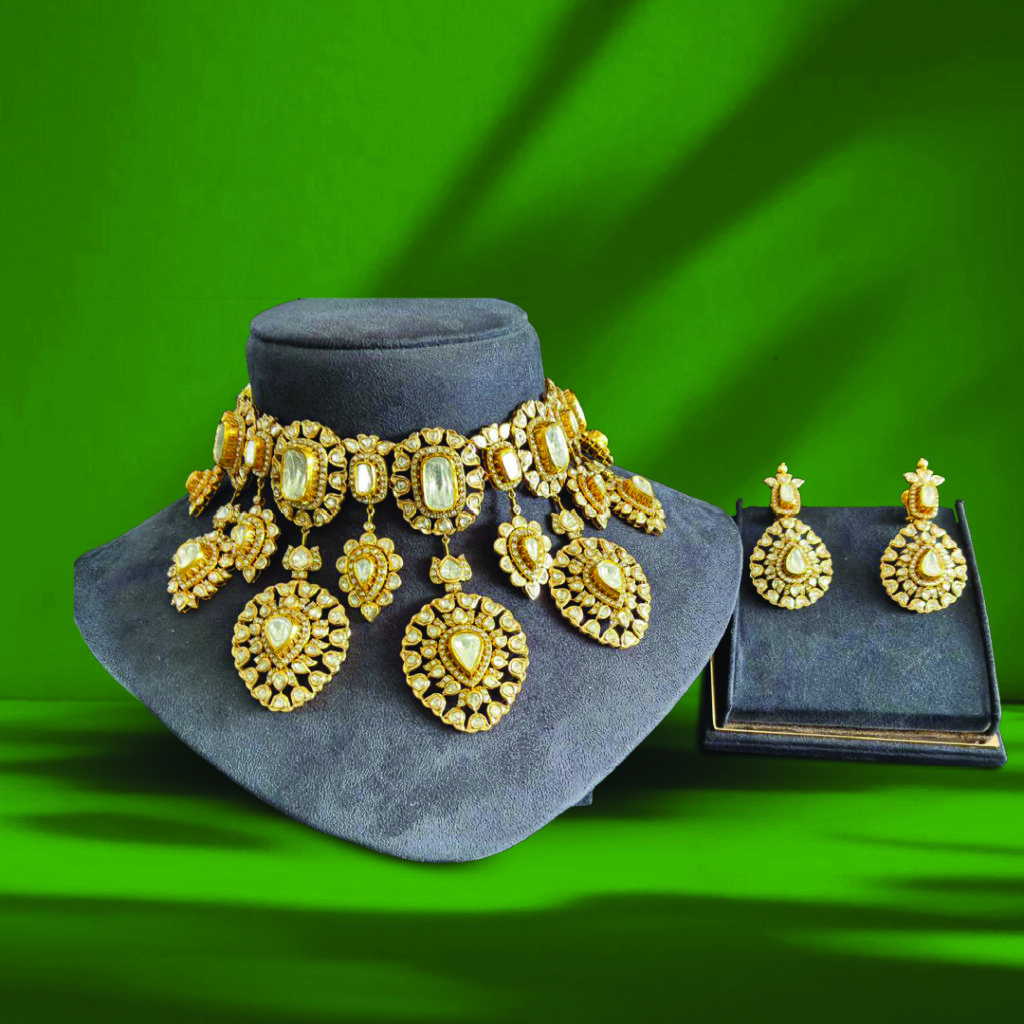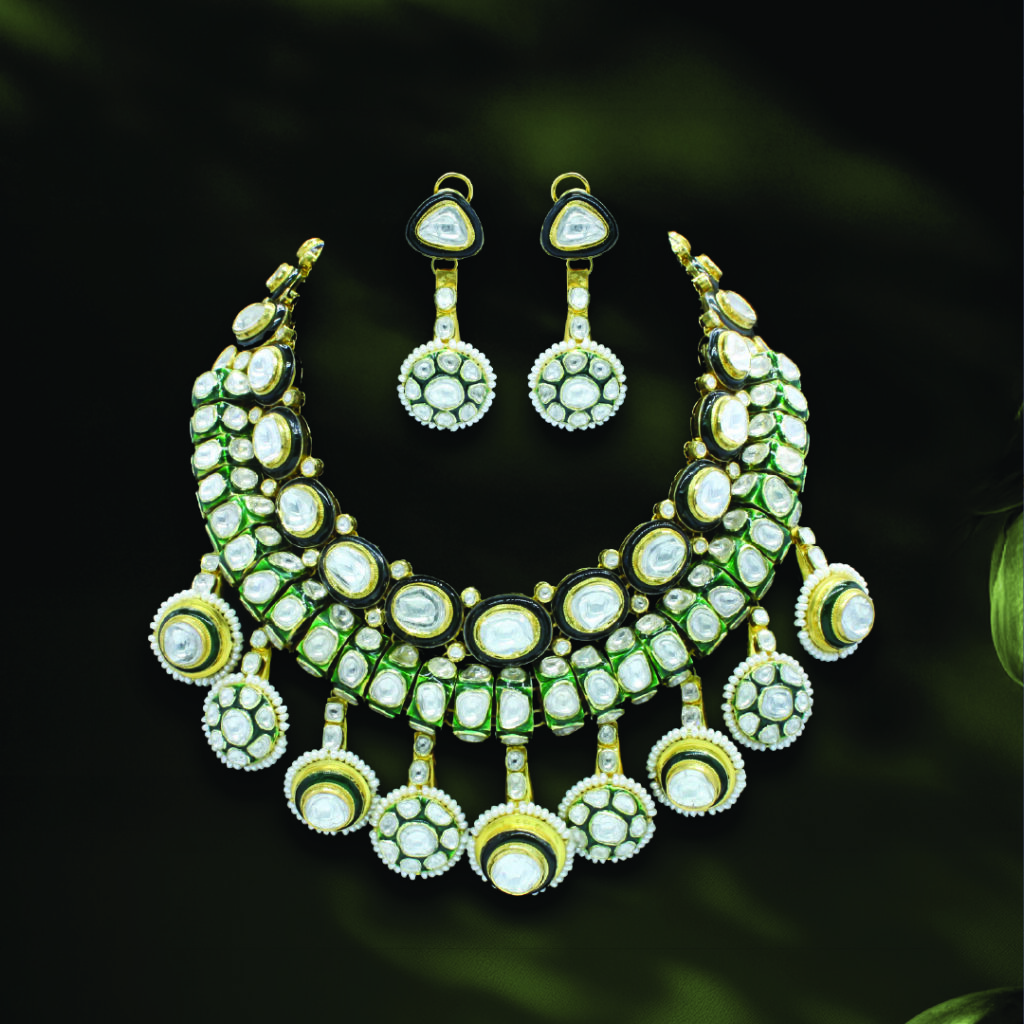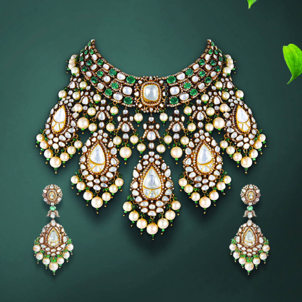 This dreamy design by Aisshpra Gems and Jewels mixes soft pearls, bold polkis, and green drops that pop in every frame. It balances delicacy with drama, giving romance a little edge and turning every photo into a moodboard moment.