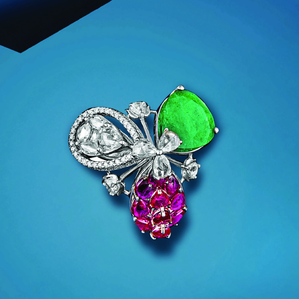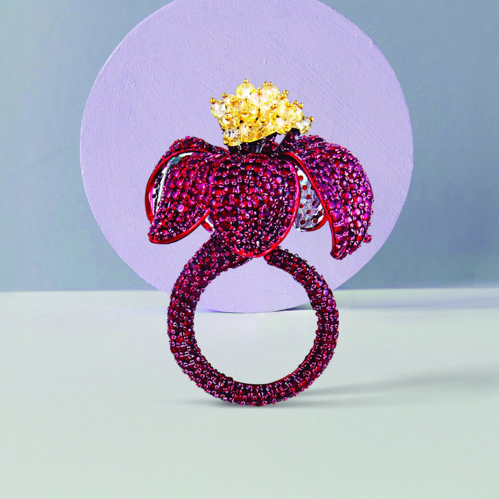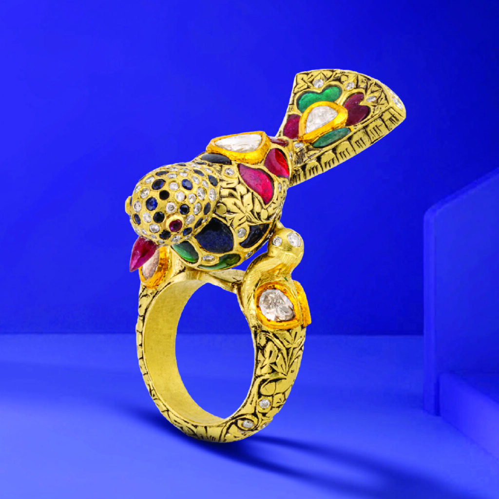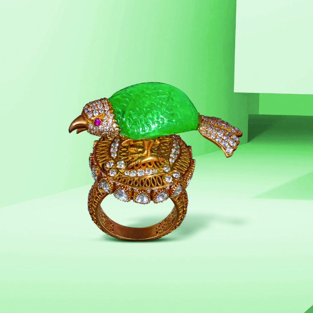 Mehta Emporium Jewellers turns gemstone carving into spectacle with a hand-carved emerald parrot poised on an ornate gold ring. Accented with diamonds and ruby eyes, the piece carries forward India’s heritage of bird symbolism while giving it a playful yet majestic modern identity.