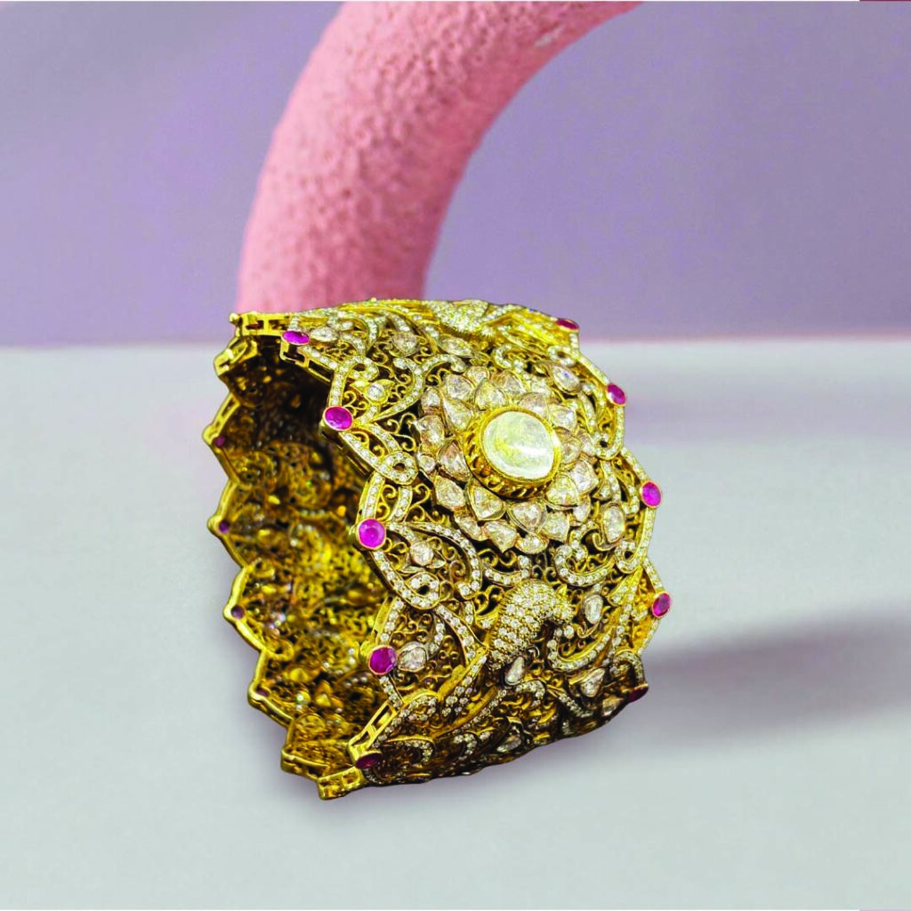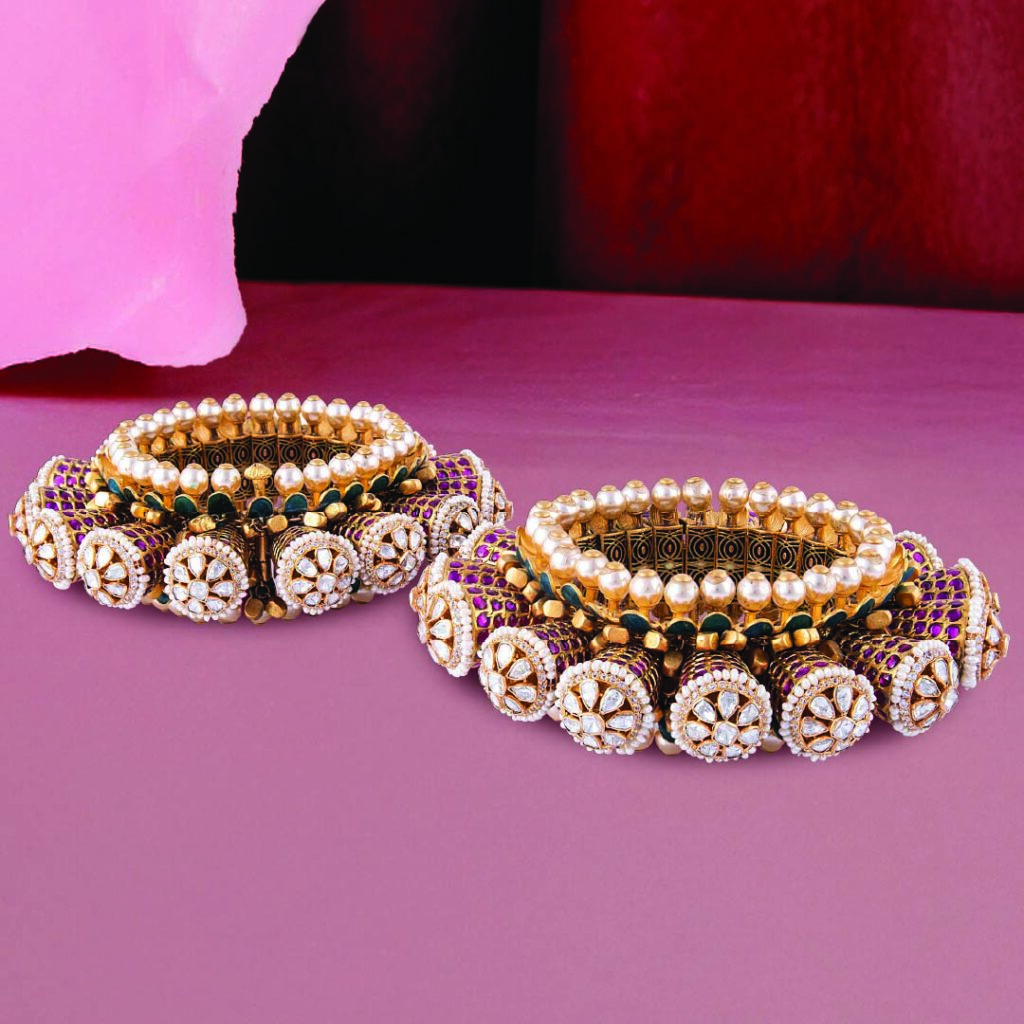 Pearls, rubies and diamonds arrange themselves in circular formations that feel architectural from every angle. Seen from above or sideways, the geometry dazzles with rhythm and precision. A bangle that doesn’t just sit on the wrist, it frames it with design perfection.